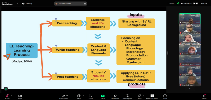 Sesi pertama dilaksanakan secara online, menghadirkan pemaparan materi oleh Dr. Sukarno, M.Hum., serta Sari Hidayati, S.S., M.A., Ph.D. dalam pengembangan bahan ajar berbasis pendekatan Genre-based Approach (GBA) dan Project-based Learning (PjBL). Sejumlah 72 peserta memperoleh wawasan mendalam mengenai bagaimana kedua pendekatan tersebut dapat diintegrasikan dalam penyusunan materi ajar Bahasa Inggris yang komunikatif, kontekstual, dan berorientasi pada keterampilan abad ke-21.